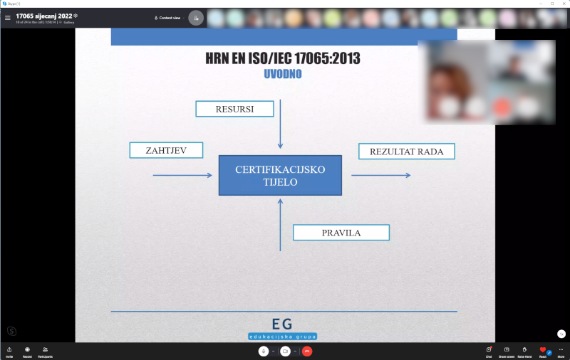 EDUKACIJSKA GRUPA održala je seminar naziva Zahtjevi norme HRN EN ISO/IEC 17065:2013 Zahtjevi za tijela koja provode certifikaciju proizvoda, procesa i usluga od 13-14. siječnja 2022. putem video konferencije preko Skypa. Zbog novonastale situacije sa epidemijom koronavirusa COVID-19 i uputa da se izbjegavaju kontakti prilagodili smo se trenutnoj situaciji. Polaznici seminara koji su sudjelovali u video konferenciji i pratili naša predavanja putem svojih računala imali su instaliran Skype, video kameru i mikrofon.
