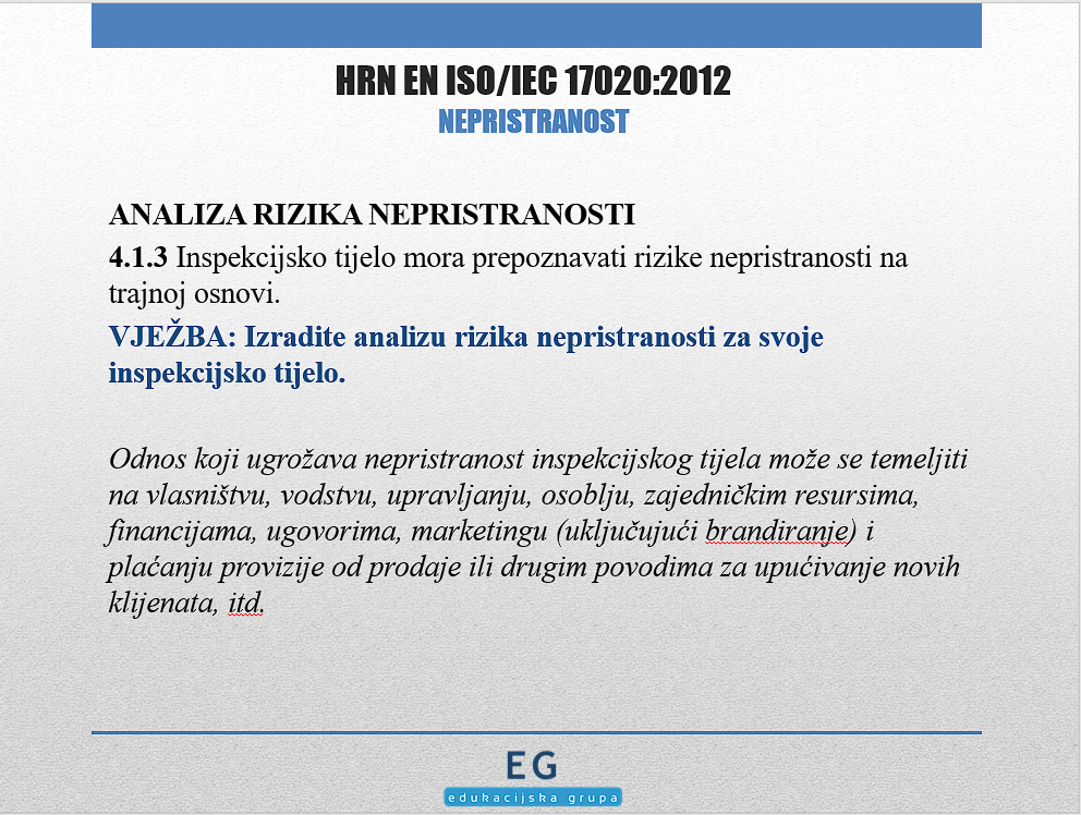 EDUKACIJSKA GRUPA održala je 22. i 23. listopada 2024. godine seminar pod nazivom Zahtjevi norme HRN EN ISO/IEC 17020:2012; Zahtjevi za rad različitih vrsta tijela koja provode inspekciju. Seminar je održan putem Skype video konferencije, a cilj je bio osigurati polaznicima upoznavanje sa zahtjevima norme, razjašnjavanje zahtjeva koje moraju ispunjavati inspekcijska tijela, kao i osposobljavanje za izradu vlastite dokumentacije sustava upravljanja te pripremu za postupak akreditacije i ocjenjivanja od strane HAA.